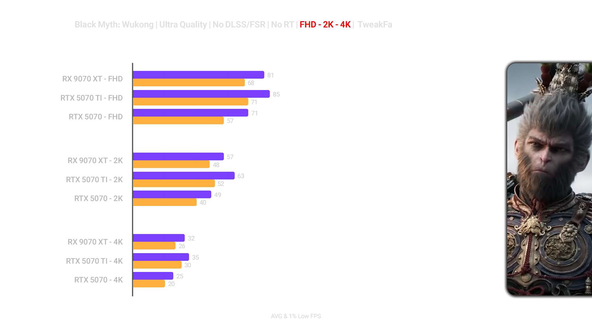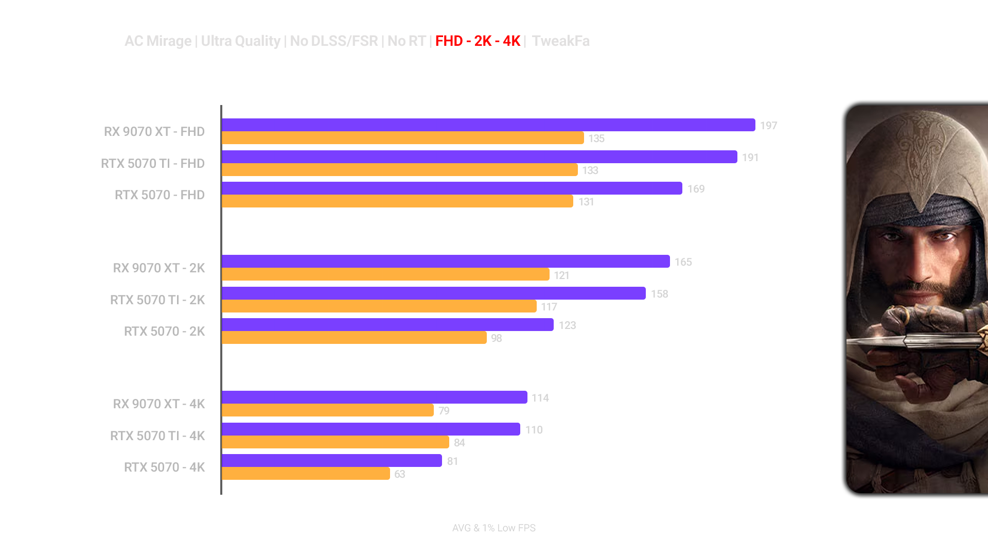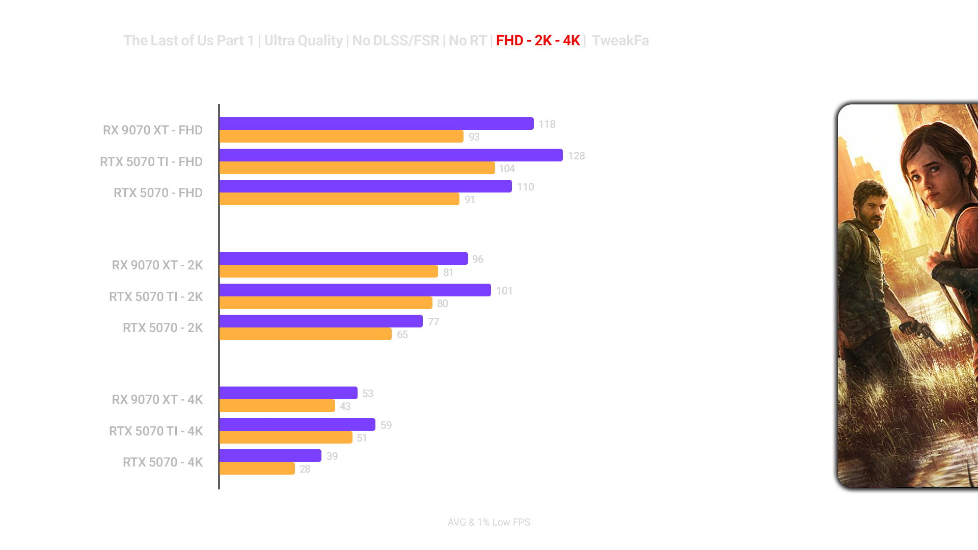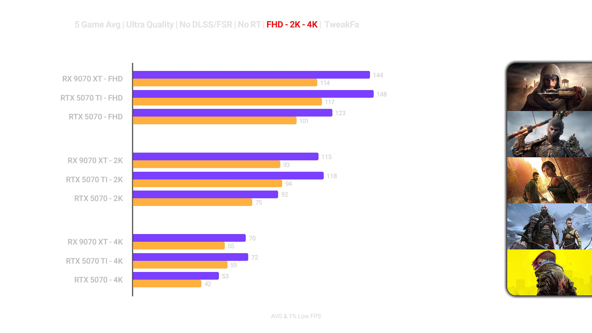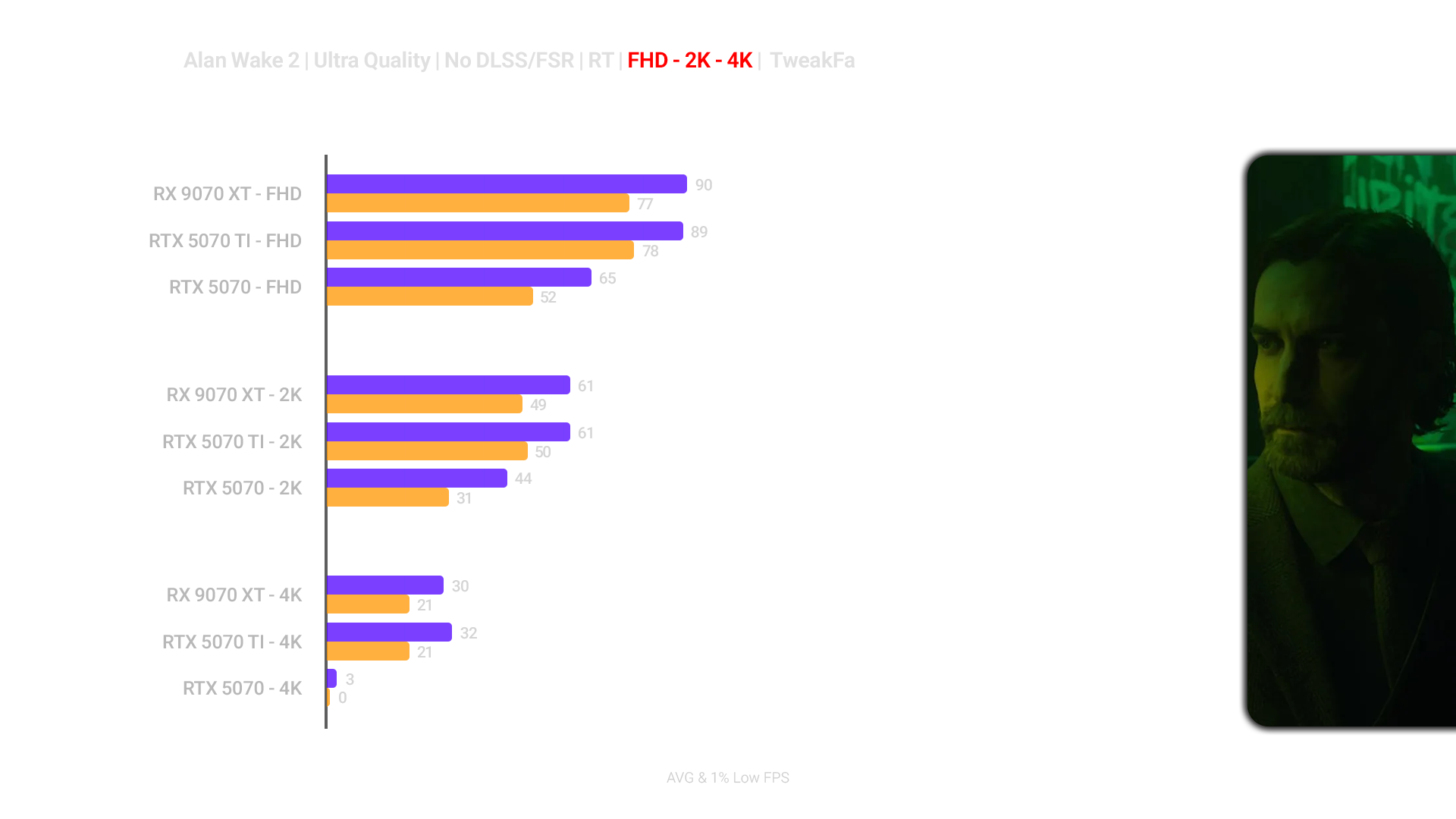 در رزولوشن 2K هم همچنان برتری 9070XT در این بازی حفظ میشه اما اختلاف فریم‌ریت همچنان انگشت شماره و هردو کارت عملکرد بسیار نزدیکی به هم دارن. تو این مقایسه قرار نیست صحبت خاصی از 5070 داشته باشیم چون اون کارت تو یه لیگ دیگه‌ایه، صرفا نتایجش رو براتون گذاشتم تا اختلاف‌ها دستتون بیاد. در رزولوشن 4K هم باز 9070XT برتری داره با 4FPS اختلاف.