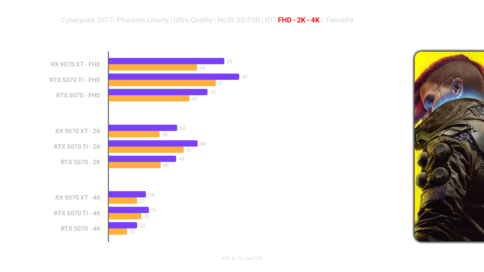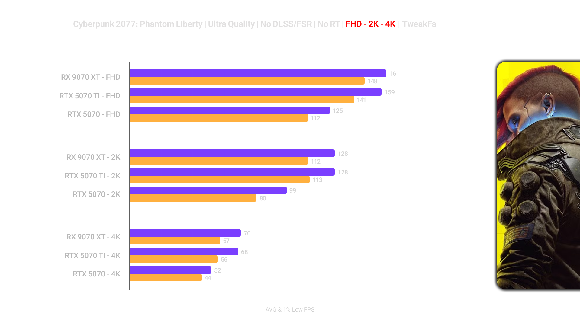 می‌رسیم بازی پنجم، سایبرپانک! بازی‌ای که انتظار داریم همچنان برتری برای 5070Ti باشه، اما نتایج شگفت‌زدمون می‌کنه. در رزولوشن FHD، برتری با اختلاف ۲ فریم برای 9070XT هستش، در رزولوشن 2K کاملا برابر عمل کردن و در رزولوشن 4K هم با اختلاف کم 9070XT برنده‌ست.