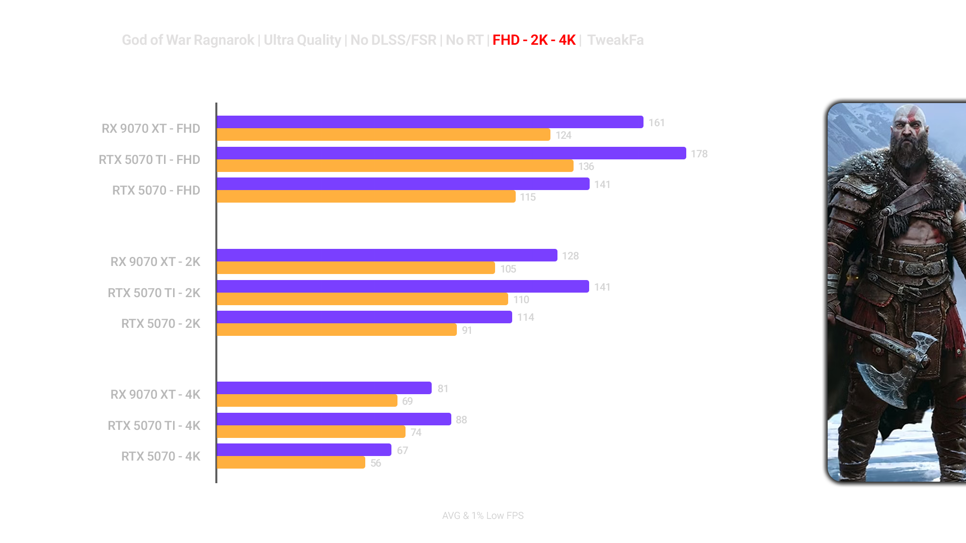 بازی چهارم، گاد آو وار رگناروک! کارت 5070Ti اختلافش باز بیشتر از لست اف آس شد، ۱۷ فریم تفاوت در رزولوشن FHD توی 2K هم اختلاف قابل توجهی دارن، ۱۳ فریم تفاوتشونه روی 4K هم توی رنج ۸۰ تا ۷ فریم تفاوت داریم که باز اختلاف کمی نیست.
