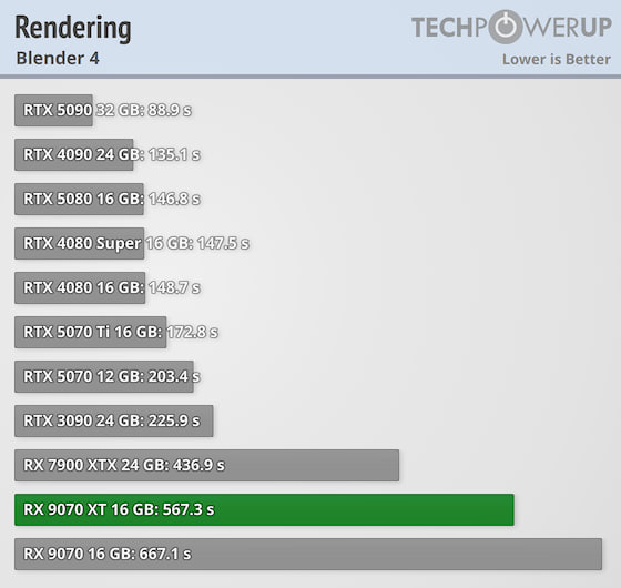 درخصوص رندرینگ به این تست بلندر TechPowerUp بسنده می‌کنیم، اختلاف اونقدر فاحش‌ئه که نیازی به توضیح نداره. اما تو نرم‌افزارهایی مثل پریمیر و داوینچی نباید انتظار چنین اختلاف فاحشی رو بین این دو کارت داشته باشید، اونجا هم اختلاف هست، زیاد هم هست ولی نه به این حدی که تو بلندر دارید می‌بینید.