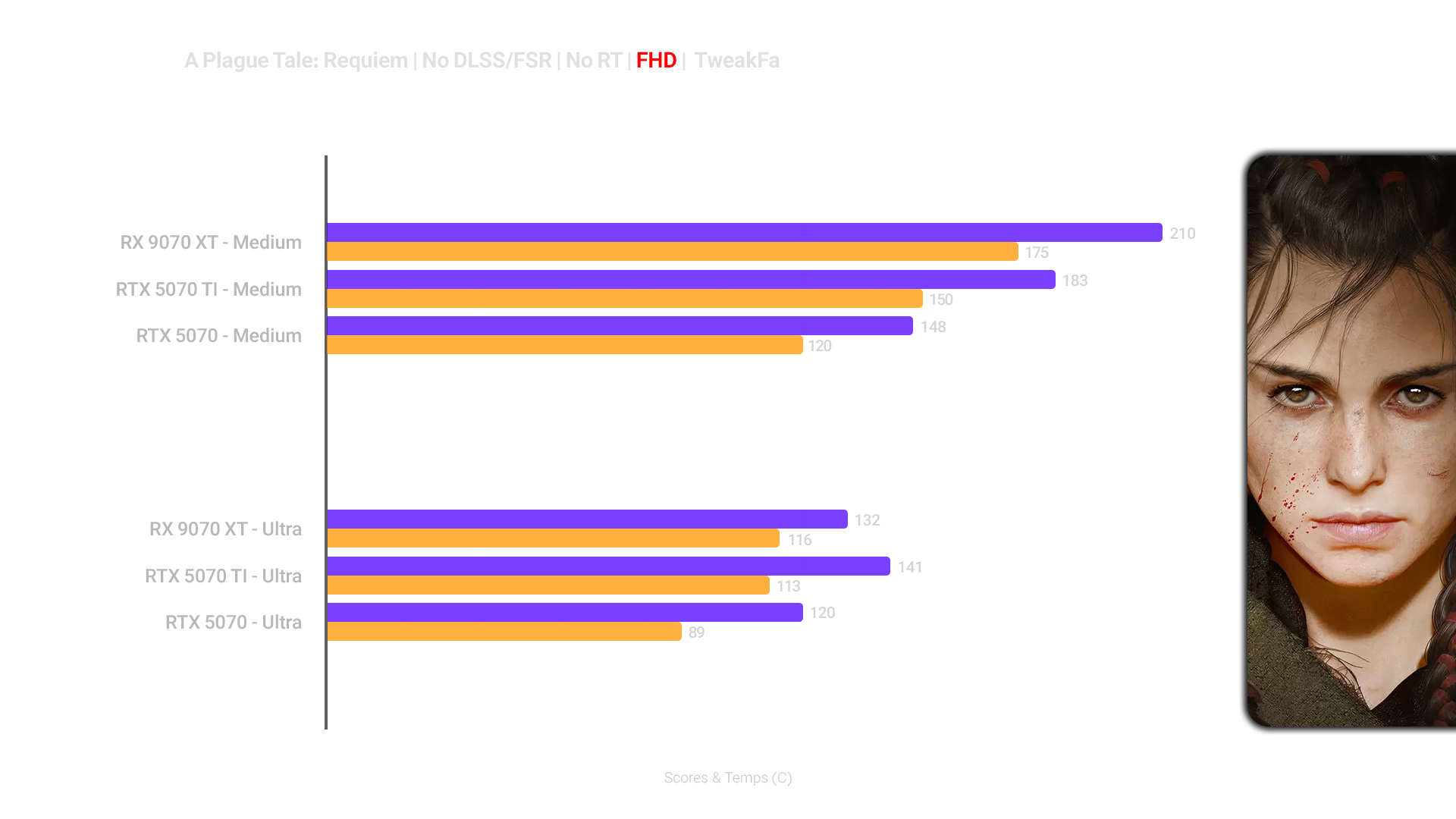 اینجا A Plague Tale: Requiem رو داریم که در دو حالت FHD با کیفیت Medium و Ultra تستش کردیم. اگر یادتون باشه حافظه کش 9070XT بیشتر از 5070Ti بود و اون کش بیشتر اینجا به کمک 9070XT میاد. وقتی رزولوشن رو FHD می‌ذاریم و کیفیت رو هم روی Low، سناریو به حالتی پیش میره که استفاده از کش L3 بیشتر نیاز میشه. مناسب کساییه که می‌خوان بازی رو با کوالیتی پایین‌تر و با FPS بالاتر تجربه کنن.